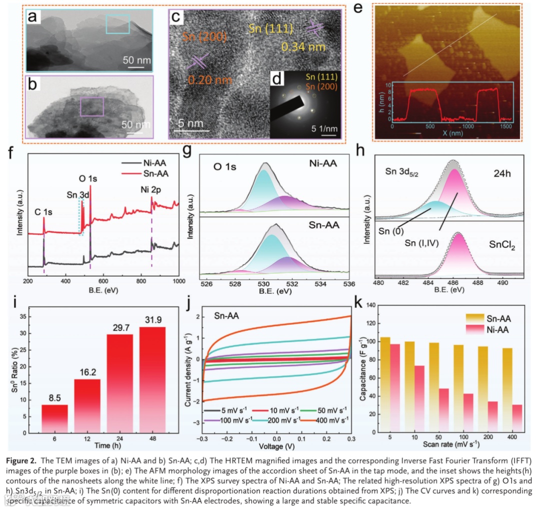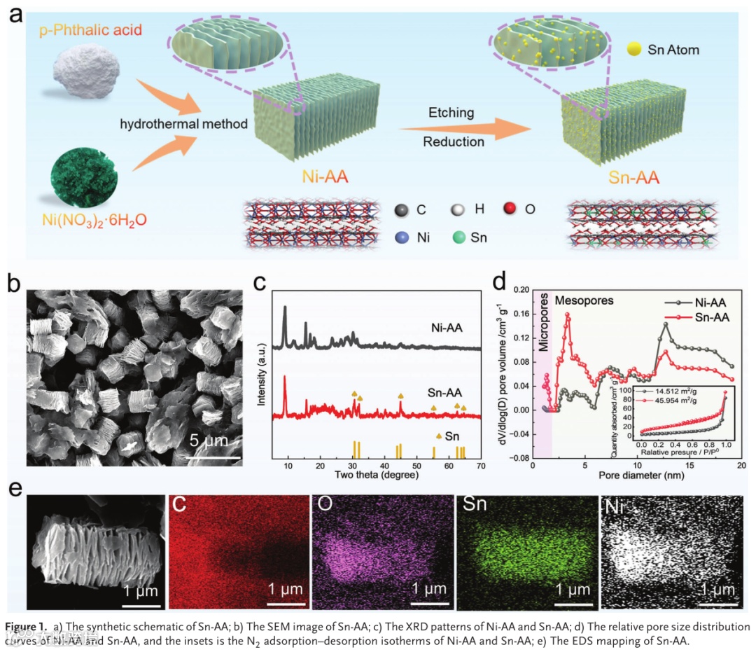 金属有机框架材料不仅由于其高表面积而具有更多的活性位点,而且其良好的定义和可定制的特征为设计具有可控形态的功能材料提供了巨大的可能性。在本研究中,合成了具有均匀分布的亲锌Sn位点的手风琴阵列纳米片(Sn-AA)作为锌金属阳极载体。Sn-AA是约为9μm的纳米片,同时具有大量Sn位点和微孔。经过循环伏安法研究,Sn-AA表现出典型的电容行为和良好的电化学可逆性,这将有利于实现离子的快速扩散。