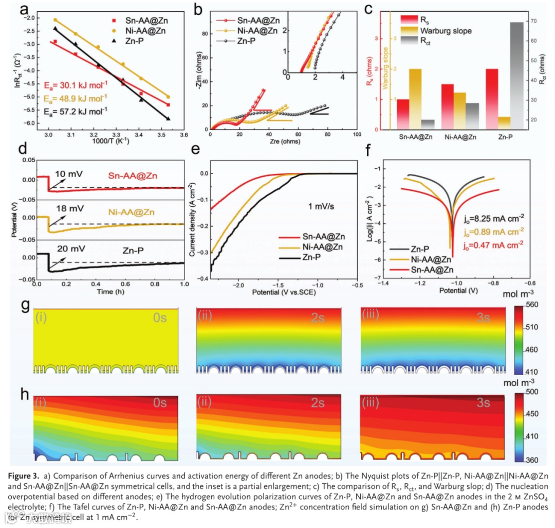 通过对称电池的电化学阻抗谱研究,证明了Sn-AA@Zn阳极具有最低的活化能(30.1 kJ mol−1),同时具有最快的离子扩散速率和电荷转移速率。迅速的离子扩散速率和电荷转移速率将有利于提高AZMB在高倍率下的使用性能。另外,Sn-AA的引入使得阳极的成核过电位和腐蚀电流密度大大减小。