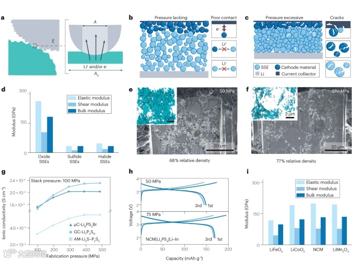 图2. 外压产生的变形和对接触性能的影响。a 粗糙表面接触状态示意图。b 欠压SSLB示意图。c 压力过大SSLB示意图。d 不同SSEs的弹性模量、剪切模量和体积模量。在50 MPa(图2e)和370 MPa(图2f)的制备压力下制备的SSE横截面扫描电子显微镜图像。g 不同类型SSE锂离子电导率的制备压力依赖性。h LiNi0.33Co0.33Mn0.33O2 (NCM)|Li3SP4|Li–In不同堆叠压力下的循环过程中充放电曲线。i 不同正极材料的弹性模量、剪切模量和体积模量。
