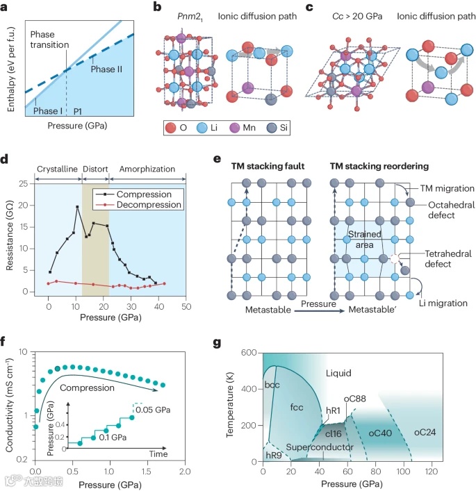 图5外压作用下的材料结构变化。a 固体材料∆S > 0情况下的焓作为压力的函数示意图。b,c Li2MnSiO4材料不同压力作用后晶胞结构(左图)和离子扩散路径(右图)示意图。d Li4Ti5O12材料在压缩和减压过程中阻抗变化。e Li[Li0.144Ni0.136Co0.136Mn0.544]O2循环后(左图)和在压力处理下再生(右图)材料的结构变化。f Li7SiPS8离子电导率随制备压力变化曲线。g 锂金属在宽压力-温度范围内的相图。