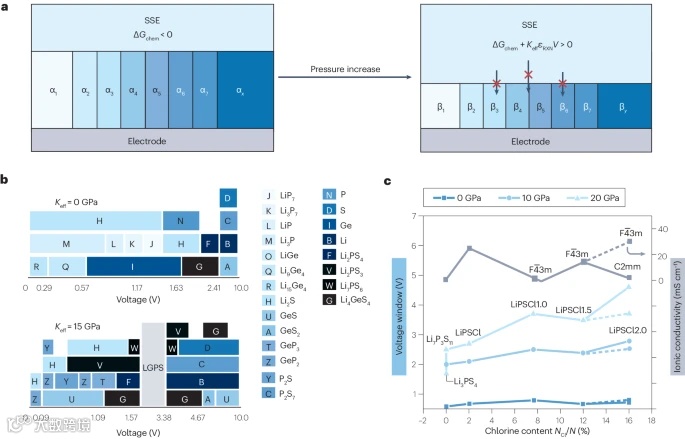 图6外压对电极-电解质界面反应的影响。a SSE在没有(左)和有(右)外部压力影响的情况下的热力学分解示意图。b 不同Keff的分解反应途径和不同电压范围内不同相位平衡导致的产物。c 不同硫化物SSEs的电压窗口和离子电导率与氯含量的关系。