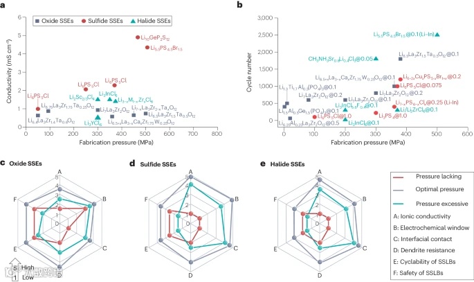 图7 外部压力对SSE和SSLB性能的影响。a 氧化物,硫化物和卤化物SSEs不同制备压力下的离子电导率。b 基于氧化物,硫化物和卤化物SSEs的Li|Li对称电池在不同制备压力下的循环性能。c–e 评估外部压力对氧化物(图7c)、硫化物(图7d)和卤化物(图7e)SSE的固有性能和电池性能的影响。对于氧化物、硫化物和卤化物 SSE,最佳压力范围可分别评估为 1−400 MPa、100−400 MPa 和 100−300 MPa。