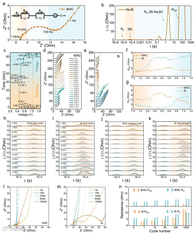 以 1 A g-1 的电流密度对 BiNC 电极和对照样品进行了原位 EIS 测试(图 3c 至图 3e)。模拟了界面 SEI 的离子传输RSEI 和电荷转移电阻 Rct 的变化趋势(图 3f 和 g)。值得一提的是,对于 BiNC,尽管预期会形成 SEI 层,但在第一个周期内没有观察到RSEI 明显增加(图 3f)。与此相反,纯 Bi 材料的 RSEI 在第一个循环中先增加后减小,在电化学过程中重复 SEI 的生长和溶解。值得注意的是,BiNC 的 RSEI 在第一个充放电周期后略有增加,这表明形成的 SEI 非常少,与高 ICE 非常吻合。DRT 图形也表明 BiNC 材料具有良好的 SEI 稳定性(图 3h 至图 3k)。此外,在整个放电/充电过程中,BiNC 的电荷转移电阻(Rct )比 Bi 小得多,表明 BiNC 的电化学反应动力学速度更快(图 3g )。如图 3l至图 3n所示,在相同循环次数下,BiNC 负极的电阻比 Bi 负极的电阻小,这表明 BiNC 具有良好的界面稳定性。