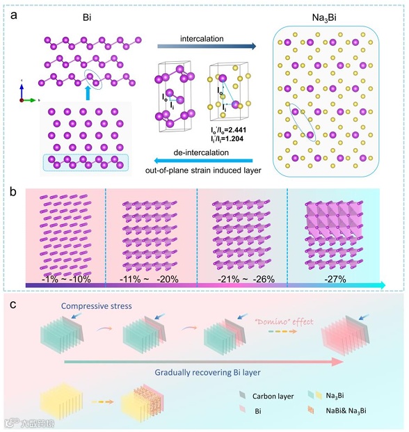 本文通过理论计算模拟了Bi在(去)合金化过程中的抗体积膨胀机制,揭示了(去)合金化过程中的不可逆相变是Bi负极结构退化的根本原因。并通过构筑刚性块体碳包覆纳米Bi颗粒的独特结构,利用块体碳产生的适当压应力诱发Bi晶体的“类多米诺骨牌”复原从而保持结构的显著稳定性。通过全面的原位TEM和原位XRD表征,首次可视化了Bi和Na3Bi之间的直接转化,并证明了由体积变化引起的应力和应变可以从铋纳米球转移到周围的碳。该研究对不良结构演变提供了新见解,并为合金型电极材料的抗降解结构设计提供了新思路和指导。