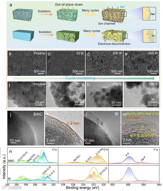 这表明在循环过程中由(脱)合金引起的部分应力被有效地转移到了周围的碳上,从而防止了 Bi 纳米球的粉碎。另外,电化学特征的差异源于 SEI 的形态,这一点可通过使用冷冻-TEM 分析 SEI的纳米结构来揭示(图 4j 至图 4m)。经过 200 次循环后,在 BiNC 表面形成的 SEI 层厚度(1.2 nm)比纯 Bi(4.1 nm)薄得多,这有利于更快的界面 Na+ 运输动力学,有助于提高 CE 和速率能力。此外,对循环后的 BiNC 表面进行了XPS分析,这种超薄 SEI 对合金电极的显著体积变化具有卓越的稳定性,因此具有良好的速率性能和循环稳定性。