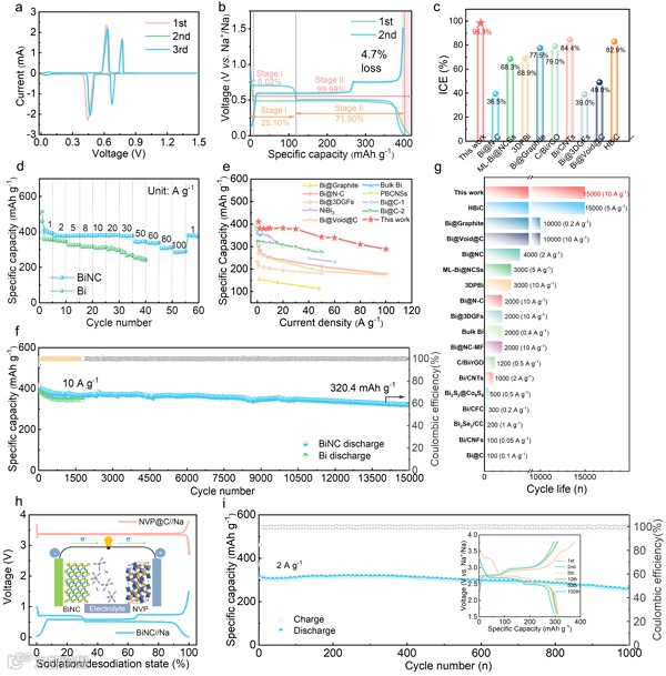 在半电池和全电池中研究了 BiNC 复合材料的储钠特性。以0.1 mV s-1的扫描速率进行循环伏安法测量(图2a),与之前报道的其他铋基电极不同,在初始放电扫描期间只出现了一个 0.46 V 的尖峰。另外BiNC 的充电/放电曲线 (GCD) 是在 1 A g-1 下测量的。同样,BiNC 在 0.47 V 处显示出一个明显的电压平台(图 2b),该结果不同于对比样的双平台。BiNC 电极提供了 398/417.8 mAh g-1的充电/放电容量, 相当于 823.1 mAh cm-3 的高体积容量, 远高于硬碳(256.7 mAh cm-3 。初始库伦效率(ICE) 值达到了令人惊喜的 95.3%。另外,对倍率性能进行了进一步研究(图 2d)。BiNC在1至100 A g-1 的电流密度下获得了 410.8 至 290.5 mAh g-1 的高可逆容量。容量保持率高达 70.3%。在 10.0 A g-1 的高电流密度下,经过 15,000 次循环后仍能保持 320.4 mAh g-1 的高容量(每个循环仅有 0.0015% 的衰减)(图 2f)。在全电池中,以Na3V2(PO4)3@C(NVP@C)为正极(图 2h),根据负极的质量,全电池的放电比容量高达 314.4 mAh g-1,在 1000 次循环后的容量保持率为 82.0%(图 2i)。