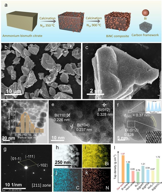 以铋铵盐复合物(Bi (NH3)2C6H7O7,BAC)为前驱体,通过简单的两步法制备致密的块体氮掺杂碳中镶嵌Bi纳米球(BiNC),合成路径如图 1a 所示。通过扫描电子显微镜(SEM)和透射电子显微镜(TEM)对其形态和结构进行了研究。获得的 BiNC 复合材料保持了前驱体BAC的块状形态,但粒径减小到 2~12 μm (图 1b 和 c),可以观察到超细 Bi 纳米球(5~25 nm) 均匀地镶嵌在块状碳中(图 1d 和 e)。与硬碳(约 0.85 g cm-3)和其他负极材料相比,BiNC的振实密度高达 1.97 g cm-3(图 1l ),在体积敏感型应用中更具竞争力。另外,该材料具有较小的比表面积,这些优点保证了其具有高初始库伦效率和高体积比容量。