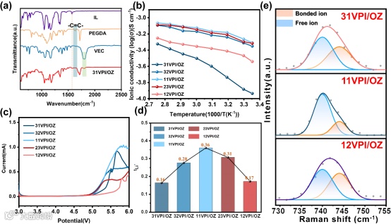 图 2 引入IL后固态聚合物电解质的电化学性能及部分红外、拉曼表征
