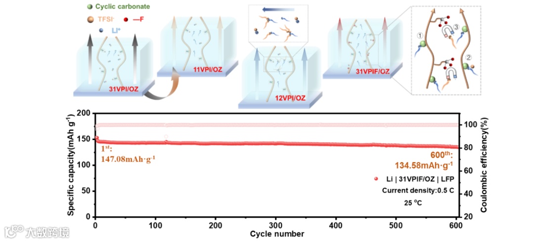 本工作通过采用原位热固化方法,利用富含极性基团的聚酯隔膜作为增强骨架,成功制备了一种聚环状碳酸酯-氟基固态电解质。在固体聚合物电解质中引入离子液体(IL)不仅可以提高聚合物链段的运动能力,以提高离子电导率,而且还与三氟甲基的协同作用,促进锂盐解离的同时限制锂盐阴离子的迁移。此外,二者与锂金属阳极反应生成富含LiF的SEI层调节锂枝晶的沉积。最终得到的31VPIF/OZ表现出卓越的离子电导率(25℃时为3.58×10-4 S cm-1)、锂离子迁移数(0.52)和电化学窗口(5.4 V)。Li | 31VPIF/OZ | Li电池在0.1mA cm-2的条件下循环1000小时而不发生短路。尤为重要的是,Li | 31VPIF/OZ | LFP电池在室温以0.5C循环600圈后,展现出91.5%的高容量保持率。因此,通过聚合物结构设计与填料的协同作用,本工作成功实现了固态锂离子电池的稳定循环,为其在可再充电锂离子电池领域的应用提供了有力的支持。成果以“Polyester-enhanced poly (cyclic carbonate-fluoride)-based polymer electrolyte for stable circulating solid lithium batteries”发表在Chemical Engineering Journal期刊上。