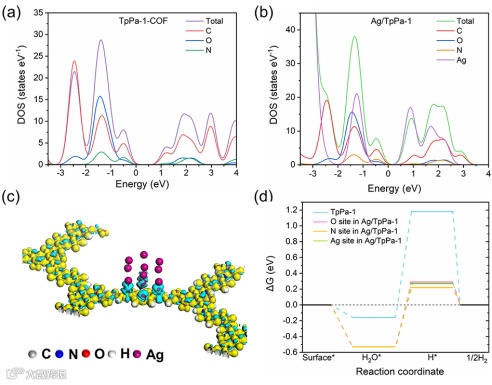 图7. (a)TpPa-1-COF的DOS和(b)Ag/TpPa-1,(c)电荷密度差图(蓝色区域表示电荷耗尽,而黄色区域表示电荷积聚)和(d)不同吸附位点的TpPa-1-COF和Ag/TpPa-1的析氢反应自由能分布图。