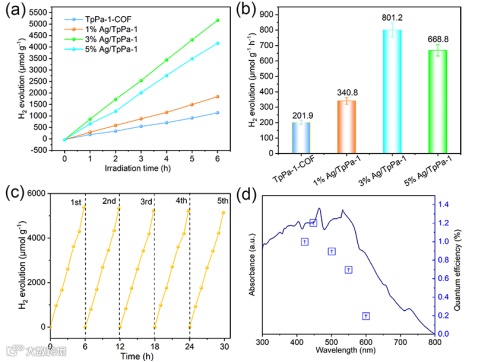图4. (a)随时间变化的光催化析氢性能,(b)柱状图中所有样品的光催化氢气析出,(c)循环过程中超过3% Ag/TpPa-1的氢气生成测试和(d)3% Ag/TpPa-1时AQE对波长的依赖性