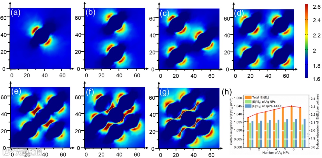 图6. 在λ = 465 nm处激发不同数量Ag NPs时Ag/TpPa-1模拟界面电场|E|/|E0|分布:(a)单个Ag NPs,(b)两个Ag NPs,(c)三个Ag NPs,(d)四个Ag NPs,(e)五个Ag NPs,(f)六个Ag NPs,(g)七个Ag NPs。(h)|E|/|E0|曲面积分。