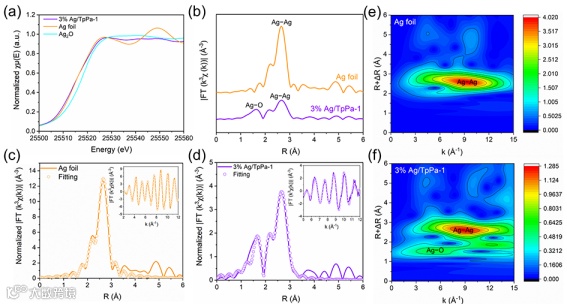 图3. (a)3% Ag/TpPa-1样品,Ag箔和Ag2O的Ag k边XANES光谱,(b)3% Ag/TpPa-1样品和Ag箔的Ag k边k3加权FT-EXAFS光谱,(c)Ag箔和(d)3% Ag/TpPa-1样品的FT-EXAFS光谱在R和k空间的拟合曲线(插图),(e和f)Ag箔和3% Ag/TpPa-1样品的WTEXAFS信号