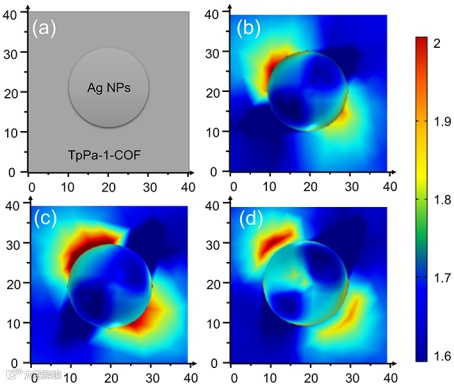 图5. (a)Ag/TpPa-1模拟模型和Ag/TpPa-1在420 nm(b)465 nm(c)和500 nm(d)激发波长下的模拟界面电场|E|/|E0|分布。Ag NPs的直径固定在20 nm。