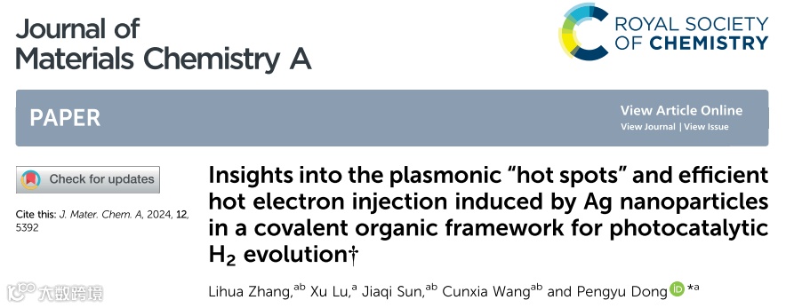Lihua Zhang, Xu Lu, Jiaqi Sun, Cunxia Wang and Pengyu Dong*, Insights into the plasmonic "hot spots" and efficient hot electron injection induced by Ag nanoparticles in a covalent organic framework for photocatalytic H2 evolution, J. Mater. Chem. A, 2024, 12, 5392-5405.