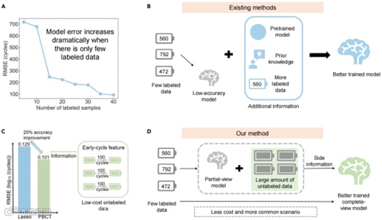 图2. 小样本条件下电池寿命预测精度提升的必要性,传统方法及半监督学习算法示意。