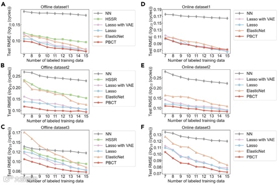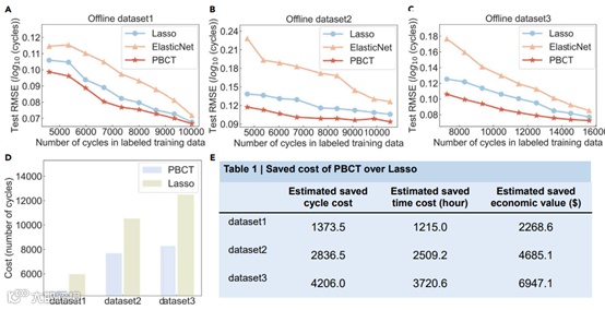 作者提出的PBCT算法不仅能更准确预测电池寿命,且具有重要的经济价值。PBCT同时利用有标签数据和无标签数据对模型进行训练,能得到一个比仅用有标签数据训练得到模型更好的效果。如果使用(全)监督学习,需要把所有电池都打上标签;如果用半监督学习,仅需要给部分电池打上标签,剩下的都是无标签数据。因为打标签需要对电池进行多次充放电循环直至电池达到终止寿命(80%的原始容量),此过程需要耗费大量的时间、能源和金钱。用PBCT算法,标记更少的电池,就能达到和全监督算法接近的预测精度,可以节约大量的成本。尤其当电池规模很大的时候,作者提出的PBCT方法能带来十分显著的经济价值。