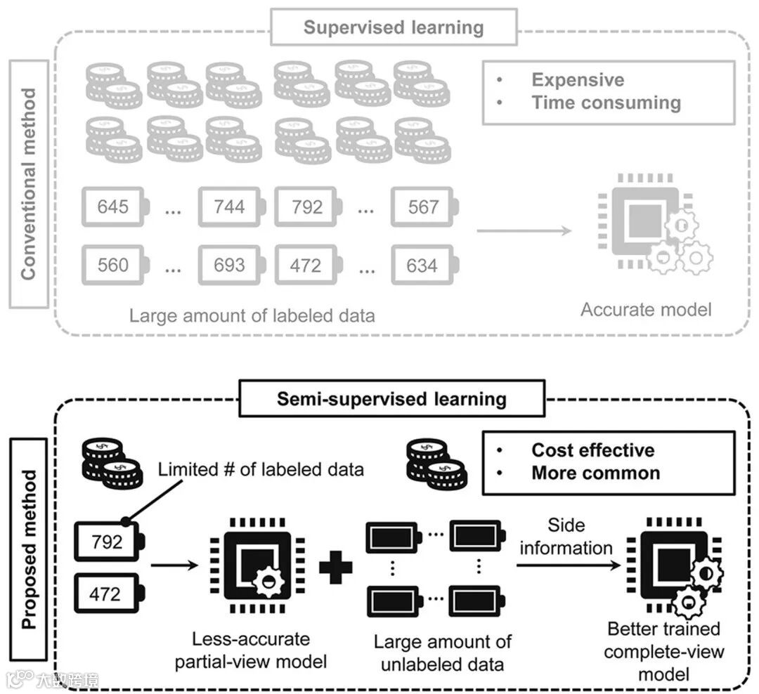 图1. 电池寿命预测算法对比:传统监督学习方法(高度依赖标签数据,耗时耗能)vs. 半监督学习方法(利用易获取的无标签数据,降本增效)。