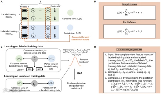 针对上述挑战,合作团队提出了利用无标签数据进行半监督学习的电池寿命预测方法——部分贝叶斯协同训练(PBCT)。作者首先用partial view model进行一个大致估计,使其能用少量样本就能得到一个相对可靠的模型;其次,再将其作为一个指引,用partial view模型产生的虚拟标签去训练一个能力更强的complete view model。接着,基于统计学原理,让这两个模型之间的预测结果互相匹配,以致最终可以得到一个更加精确的训练效果。PBCT充分利用了这些低成本且丰富的无标签数据,通过提取其中的隐藏信息,深化了对底层数据模式的认识,进而显著提升了电池寿命预测的精确度。
