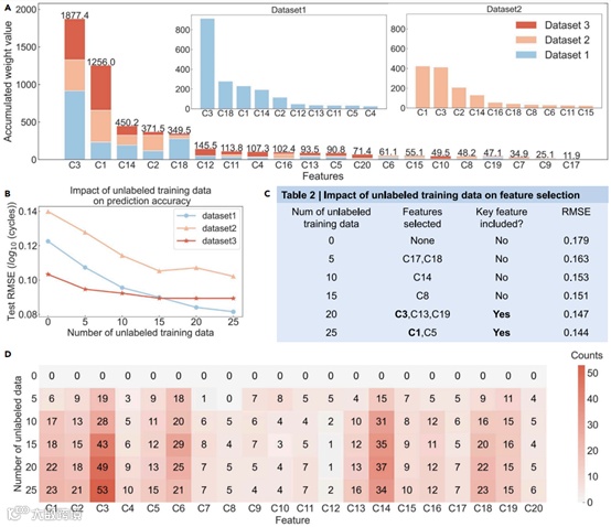 相较于传统经典的数据驱动方法,作者提出的PBCT算法使用的无标签数据,不仅能提升电池寿命的预测精度,还能帮助揭示影响电池寿命的关键因素。通过进一步的实验与分析,作者发现在同样的条件下,当作者用了更多的无标签数据,PBCT算法能更容易地把影响电池寿命的关键特征筛选出来。相应的,在选出关键特征的同时,新模型也提升了电池寿命预测的准确率。所以,随着无标签数据的引入,PBCT半监督学习算法无论是在实际效果上,还是可解释性上,都提升了电池寿命预测模型的性能。