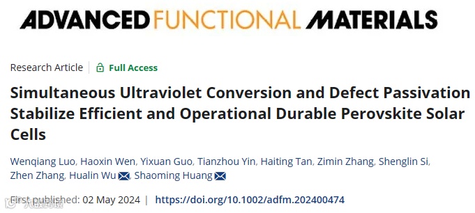 近日,广东工业大学黄少铭教授团队的吴华林副教授在国际知名期刊《Advanced Functional Materials》上发表题目为“Simultaneous Ultraviolet Conversion and Defect Passivation Stabilize Efficient and Operational Durable Perovskite Solar Cells”的研究工作。