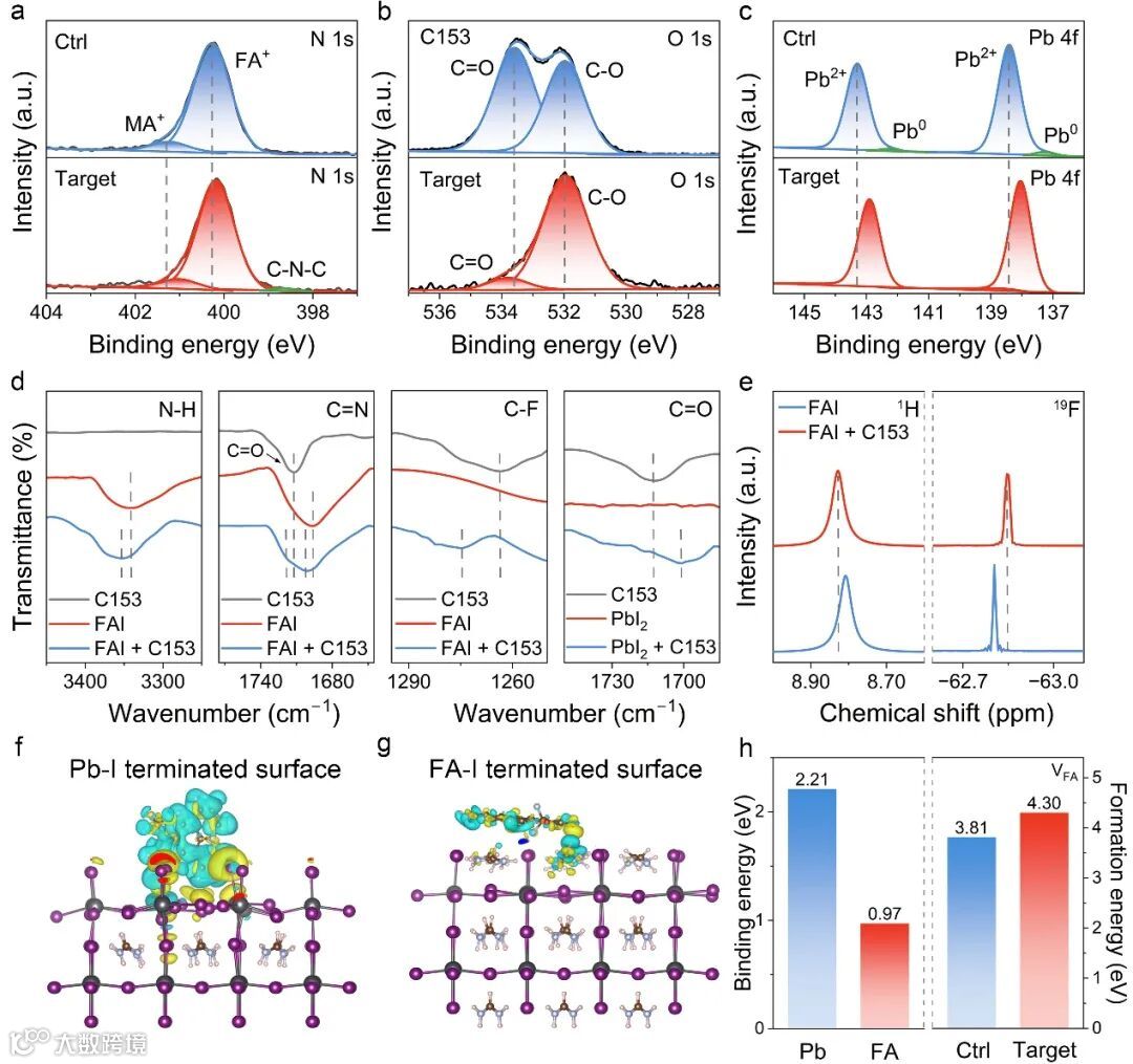 通过XPS、FTIR、NMR以及第一性原理密度泛函理论(DFT)等表征深入探究C153与钙钛矿组分间的相互作用机理。XPS、FTIR结果显示,C153的–C=O基团通过路易斯酸碱作用与薄膜中的未配位Pb2+相互作用;而–CF3、–C=O则与FA+形成氢键,这一结果通过NMR得到印证。此外,DFT计算结果表明C153与钙钛矿有较强的结合力,表现为与Pb-I封端和FA-I封端2.21、0.97 eV的结合能,而FA表面空位形成能(VFA)则从3.81 eV增加到4.30 eV。因此推测C153的引入可显著减少缺陷,并大幅提高钙钛矿结构的稳定性。