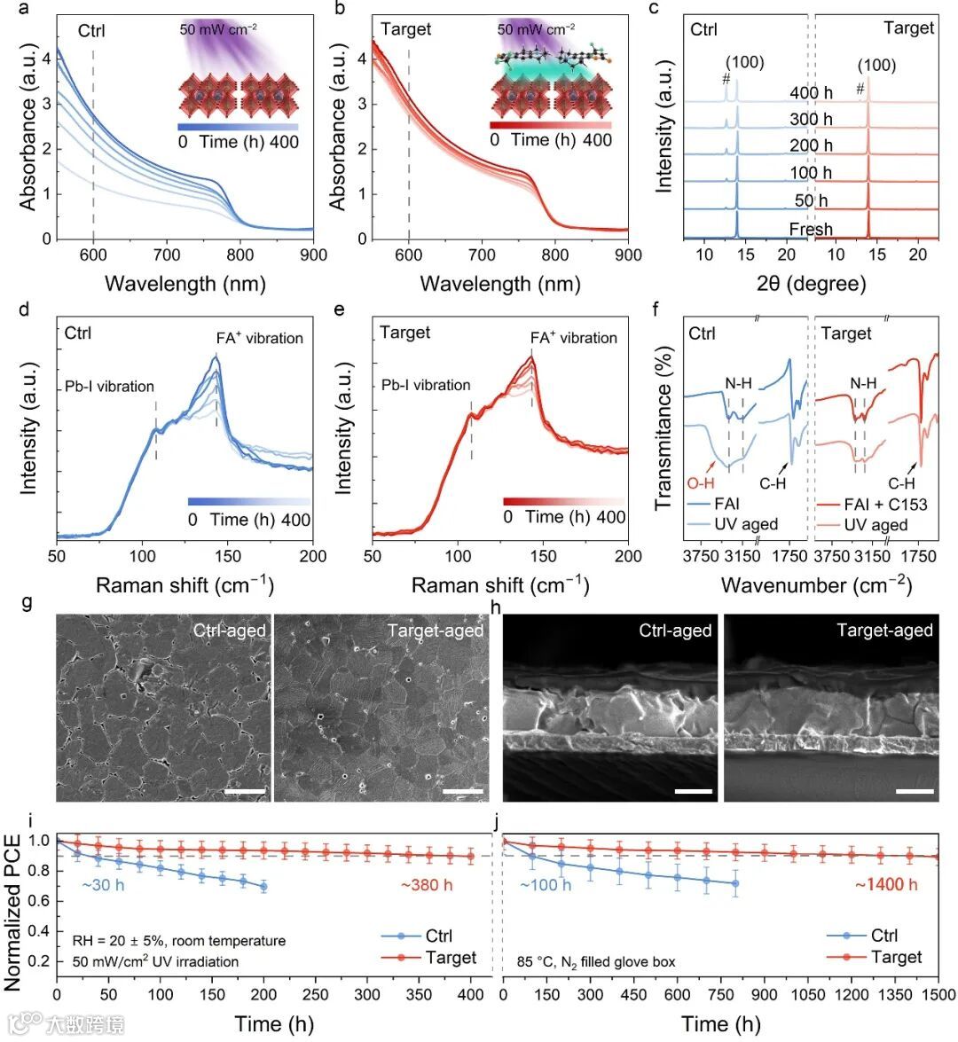 通过追踪在UV辐照下钙钛矿薄膜的吸收强度、晶体结构、Pb–I和FA+拉曼信号的动态演变以及FAI中N–H和C–H化学键的稳定性,揭示了C153分子抵抗UV辐照和稳固钙钛矿结构的内在机理;同时,器件埋底界面和截面SEM组织形貌的降解程度,也印证了分布于埋底界面的C153分子起到有效过滤紫外线提高钙钛矿层稳定性的作用。基于此,经C153分子处理的器件在50 mW cm−2持续紫外照射、85℃热应力和1-sun太阳光照下分别老化~380、~1400和1710 h后仍能保持90%的初始效率,这明显优于原始器件的~30、~100和170 h,证实了C153分子在提高紫外线辐射、热应力和光照下的运行稳定性方面起着至关重要的作用。