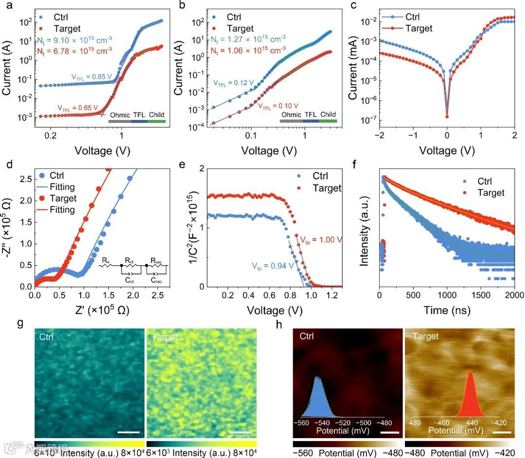 空间电荷限制电流、暗态电流、阻抗谱、模特肖特基曲线等表明C153分子的引入大幅降低了钙钛矿薄膜的缺陷态密度,同时增强了界面电荷传输并提高了器件的内建电场;TRPL结果表明处理后显著提高的载流子寿命,而更加均匀、更高强度的PL-mapping分布和更窄、更均匀的KPFM-表面电势分布意味着缺陷相关的非辐射复合得到有效抑制。此外,处理后钙钛矿表面功函数的显著增加也表明有利于促进异质结处光生载流子的提取和减少器件的开压损失。
