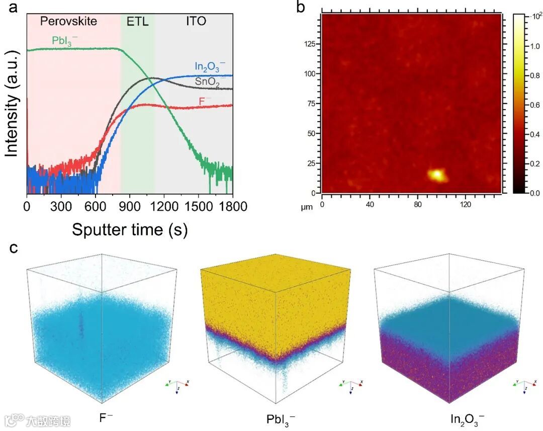 此外,通过飞行时间二次离子质谱(ToF-SIMS)深度剖析实验探究了C153分子在钙钛矿膜中的分布。由ToF-SIMS测定的PbI3−、F−、SnO2−和In2O3−离子随深度的分布和钙钛矿表层F−离子成像图的结果,可以清楚地得出C153分子主要分布在钙钛矿薄膜的埋底层界面,在钙钛矿上表面和体相上分布浓度较低,这也与3D空间分布结果相吻合。