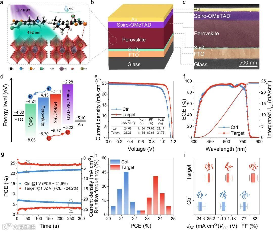该研究提出将一种新颖的具有紫外线(UV)转换的功能化小分子香豆素153(C153)明智地引入钙钛矿前驱体中,以实现有效提高器件效率和抗紫外线辐射的运行稳定性。研究发现,C153中的–C=O and –CF3基团能够与Pb2+配位,并通过氢键抑制A位阳离子空位的形成,从而稳固钙钛矿结构并显著减少了本征有缺陷。同时,由C153分子的下转换效应产生的可见光吸收增量以及优化的能级排列增强了器件的光电流。基于此,调控后的器件获得了24.73%的冠军效率,同时表现出显著提高的环境运行稳定性,未封装器件在持续紫外线辐照、热应力和白光照射下分别老化~380、~1400和1710 小时后仍能保持90%以上的初始效率。该研究工作为提高PSCs效率和环境稳定性提供了有效可行的策略。