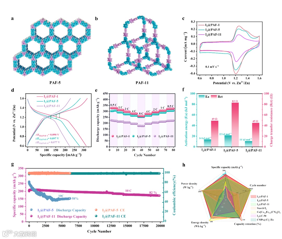 图 5:(a) PAF-5 和 b) PAF-11 的拓扑结构;(c) 采用 PAF-1、PAF-5 和 PAF-11 电极的 Zn-I2电池的 CV 图;(d)充放电曲线图;(e)速率性能;(f)三材料电池的 Ea 和 Rct;(g) 采用 PAF-11 和 PAF-5 的 Zn-I2电池的长期性能;(h)三材料电极的 AZIB 的电化学性能与之前报道的作品相比较。
