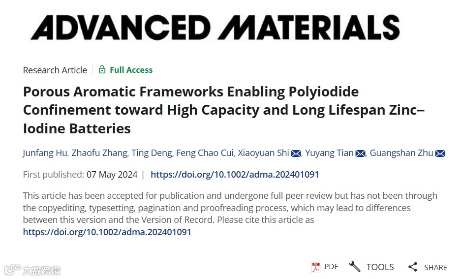近日,东北师范大学的朱广山教授/史晓媛课题组,在国际知名期刊Advanced Materials上发表题为“Porous Aromatic Frameworks Enabling Polyiodide Confinement toward High Capacity and Long Lifespan Zinc‐Iodine Batteries”的研究论文。该工作首次报道了以多孔芳香骨架(PAF)作为碘负载材料,构筑高性能水系锌碘电池。。PAF-1因其与碘之间的电荷转移相互作用、高比表面积以及相互连接的三维通道,展现出优异的多碘化物限域能力和快速的离子传输特性。实验和理论计算结果表明,PAF-1不仅显著提高了锌-碘电池的比容量(达到328 mAh g−1),还实现了超过20000圈的循环寿命,为开发下一代高能量密度和长寿命的水系锌-碘电池提供了重要的材料选择和研究基础。