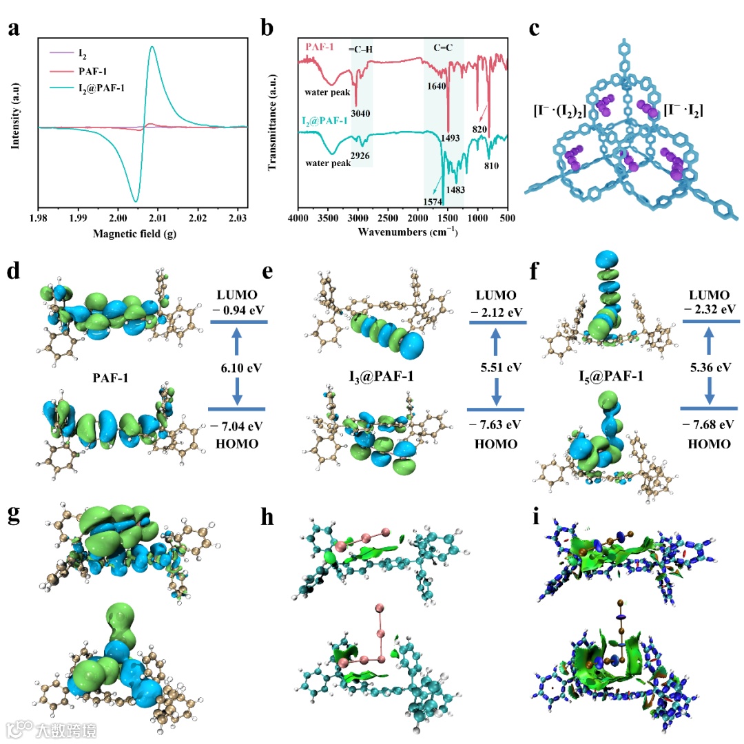 图2:(a)I2、PAF-1 和 I2@PAF-1 的 EPR 光谱;(b)PAF-1和I2@PAF-1的FTIR光谱;(c)I,I和PAF-1宿主之间的相互作用示意图;d) PAF-1、e)I@PAF-1 和 f)I@PAF-1 的 HOMOs 和 LUMOs;(g)I@PAF-1 和 I@PAF-1 的 EDD;(h)I@PAF-1 和 I@PAF-1的IGMH;(i)I@PAF-1 和 I@PAF-1的IRI。