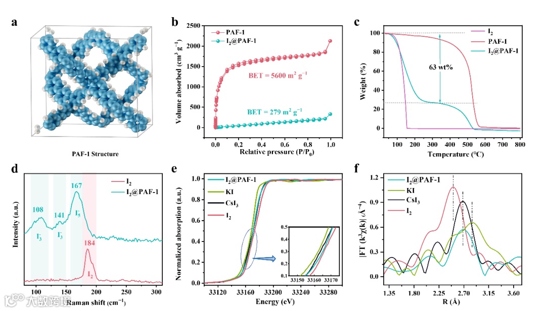 图1:(a)PAF-1金刚石拓扑结构;(b)PAF-1和I2@PAF-1在 77 k的N2吸附等温曲线;(c)I2、PAF-1和I2@PAF-1的热重分析;(d)I2和I2@PAF-1的拉曼光谱;(f)I2、KI、CsI3和I2@PAF-1的XANES光谱;(f)I2、KI、CsI3和I2@PAF-1的EXAFS光谱。