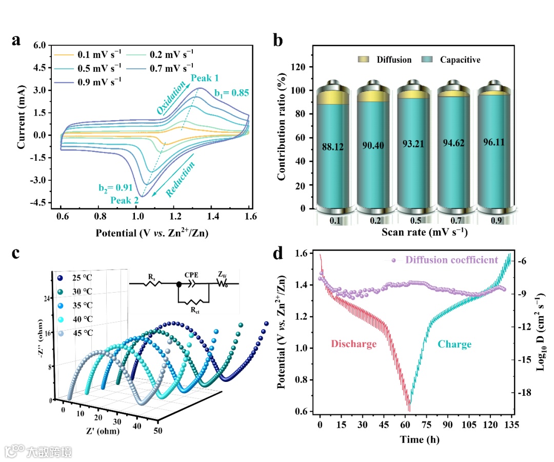 图 4:(a) Zn-I2@PAF-1 电池在 0.1 至 0.9 mV s-1 不同扫描速率下的 CV 曲线。(b)I2@PAF-1 阴极在不同扫描速率下的表面和扩散控制容量比例。(c) Zn-I2@PAF-1 电池在不同温度下的奈奎斯特图。(d) I2@PAF-1 阴极在 0.5 C下,一个充放电周期的 GITT 曲线(红线和蓝线)和 I- 扩散系数(紫色)。