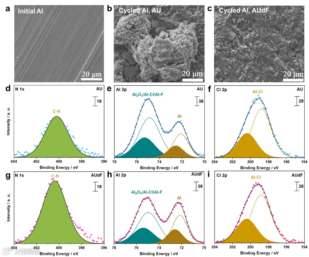 图3d-i为循环后AMA的XPS光谱。在N 1s光谱(图3d,g)中,位于约400 eV处的峰为尿素的C-N键。在Al 2p光谱(图3e,h)中,可以在72.1和75.0 eV观察到两对Al 2p峰。前者对应于金属铝Al0,而后者可以被归属为包括Al2O3、Al-Cl和Al-F在内的SEI组分。将N 1s光谱中的C-N和Al 2p光谱中的Al2O3/Al-Cl/Al-F的峰强度与Al 2p光谱中的Al0峰强度进行比较,可以发现在AUdF中循环的电极表面在XPS探测深度范围内具有更多的金属铝和C-N。这表明dFBn导致了更薄的SEI并促进了尿素对SEI的贡献。