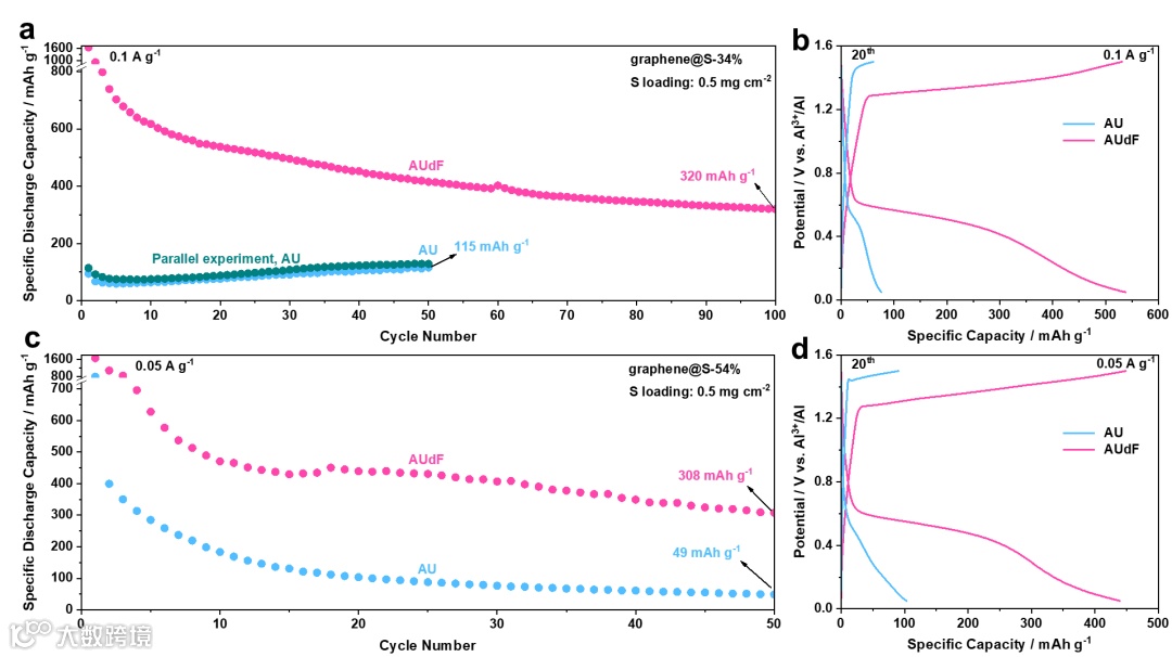 图5. 采用AU和AUdF作为电解质的铝-硫电池在20°C下的电化学性能。