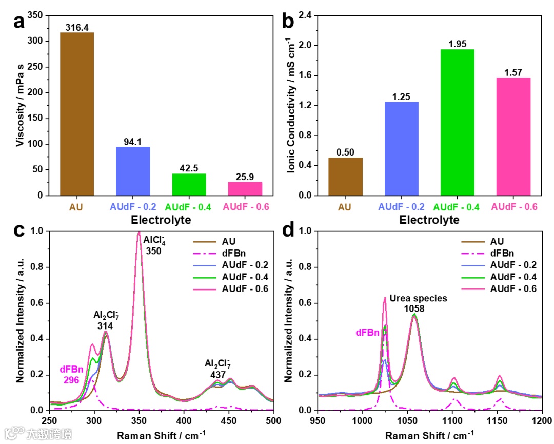 将配置的AU和dFBn进行混合,即可得到LC-DELE。其成分可以表述为[AlCl3]1.3[Urea]1[dFBn]x,并简称为AUdF-x(x = 0.2, 0.4, 0.6)。图1为所获得电解液的粘度、电导率、和Raman光谱。如图1a所示,AU的粘度高达316.4 mPa s;随着dFBn的加入,AUdF-x的粘度显著降低。AUdF-0.6的粘度仅为25.9 mPa s。图1b表明,AUdF的加入对离子电导率具有改善作用,AUdF-0.4表现出最高的电导率为1.95 mS cm-1。图1c,d表明,dFBn的加入并不会影响电解液中的AlCl4-,Al2Cl7-和urea基离子的动态平衡。