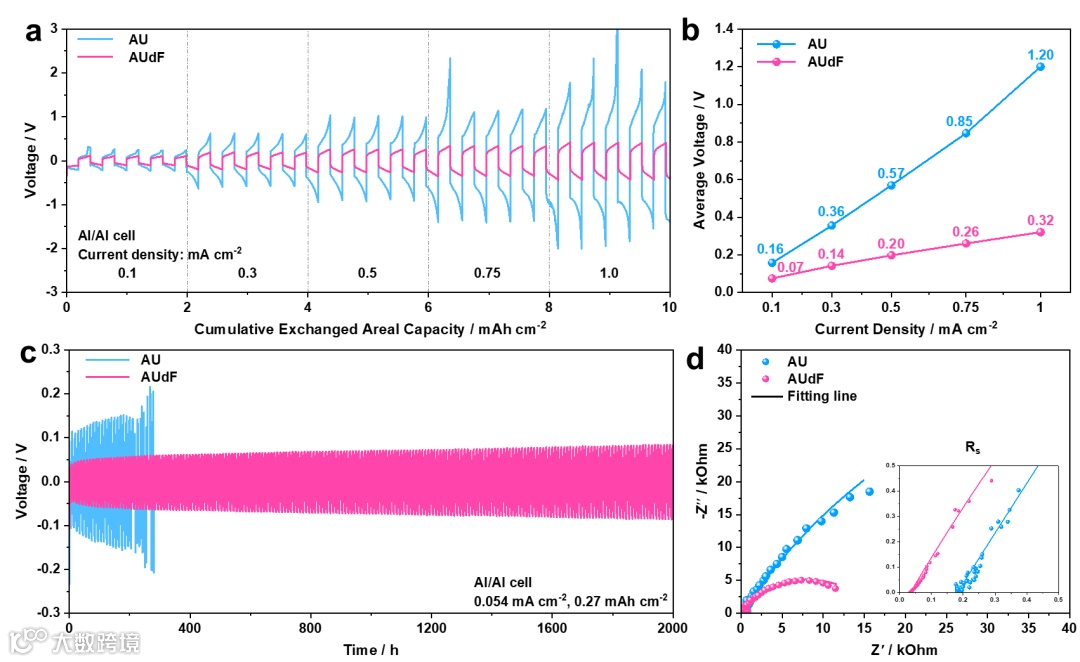 通过Al/Al对称电池在20 °C的充放电循环以及电化学阻抗谱评估dFBn对铝金属负极(AMAs)的电化学性能的影响(图2)。结果表明,dFBn显著降低了电池的极化并提升了电池的循环稳定性。从电化学阻抗谱可以看出,AUdF的使用有效降低了电解液内离子传输的阻抗以及铝金属的界面阻抗。