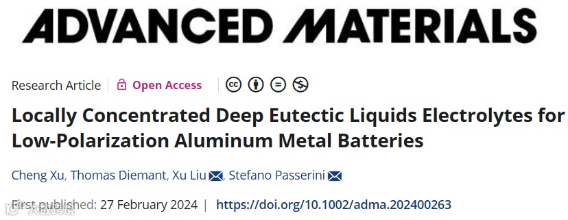 Cheng Xu, Thomas Diemant, Xu Liu*, Stefano Passerini*, Locally Concentrated Deep Eutectic Liquids Electrolytes for Low-Polarization Aluminum Metal Batteries, Advanced Materials, 2024,