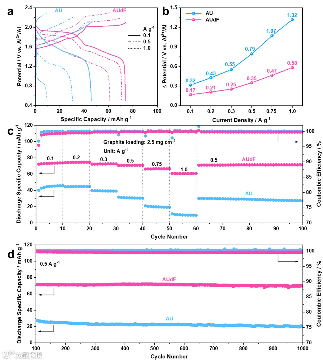 图4. 采用AU和AUdF作为电解液的铝-石墨电池在20°C下的电化学性能。