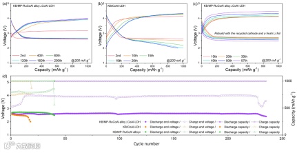 作者对比研究了MP-RuCoAl Alloy⊥CoAl-LDH、MP-RuCoAl Alloy#、CoAl-LDH三种电催化剂在Li−CO2电池中的电化学性能。如图7a&d,KB/MP-RuCoAl Alloy⊥CoAl-LDH电池以200 mA g−1进行充放电时可稳定循环227次,且充电电压稳定在~4.0 V,低于大多数已报道的Co基催化剂。MP-RuCoAl Alloy#和CoAl-LDH电池在200 mA g−1表现出较大的充放电极化,几十次循环后即触发电压截止。