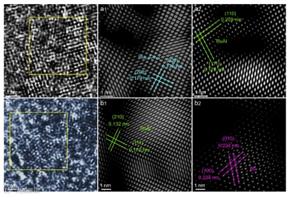 图4 MP-RuCoAl Alloy⊥的(a, b) HRTEM和(a1, a2, b1, b2) 反傅里叶变换(IFFT)图。
