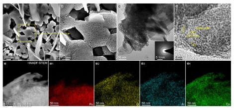 图3. MP-RuCoAl Alloy⊥CoAl-LDH的形貌表征。(a, b) SEM; (c) TEM; (d) HRTEM; (e−e4) HAADF-STEM图及相应的元素分布。