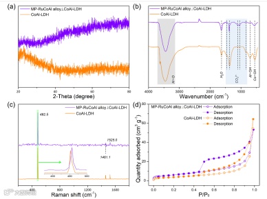 XRD衍射花样未检测到明显的衍射峰,表明MP-RuCoAl Alloy⊥CoAl-LDH和CoAl-LDH具有非晶和/或弱晶特征(图2a)。作者采用FTIR和Raman对所制备样品的成分进行了进一步研究,均观察到指征为LDH的特征信号。特别地,图2c中,MP-RuCoAl Alloy⊥CoAl-LDH和CoAl-LDH分别在~482.5 cm−1和~480.7 cm−1 显示出高强度的拉曼峰,表明两种材料中的CoAl-LDH具有弱结晶性。这一观察与XRD测试结果一致。此外,氮气吸脱附测试表明MP-RuCoAl Alloy⊥CoAl-LDH(~21.9 m2 g−1)具有显著高于CoAl-LDH(13.4 m2 g−1)的比表面积(基于BET方法)。