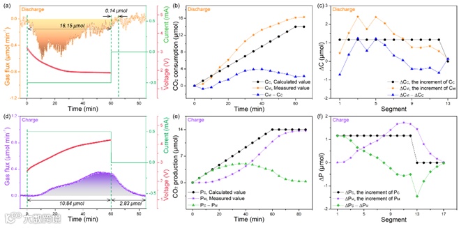 图8. 以MP-RuCoAl Alloy⊥CoAl-LDH为正极催化剂构筑的Li−CO2电池的原位DEMS测试。(a−c)充电过程中的气体消耗;(d−f)放电过程的气体析出。
