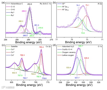 图5. MP-RuCoAl Alloy⊥CoAl-LDH各元素的高分辨XPS谱图。(a) Ru 3d & C 1s; (b) Al 2p; (c) Co 2p; (d) O 1s。