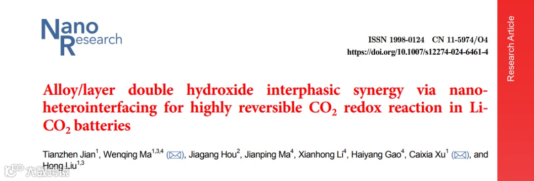 1. Alloy/layer double hydroxide interphasic synergy via nano-heterointerfacing for highly reversible CO2 redox reaction in Li–CO2 batteries. Nano Research, 2024, https://doi.org/10.1007/s12274-024-6461-4