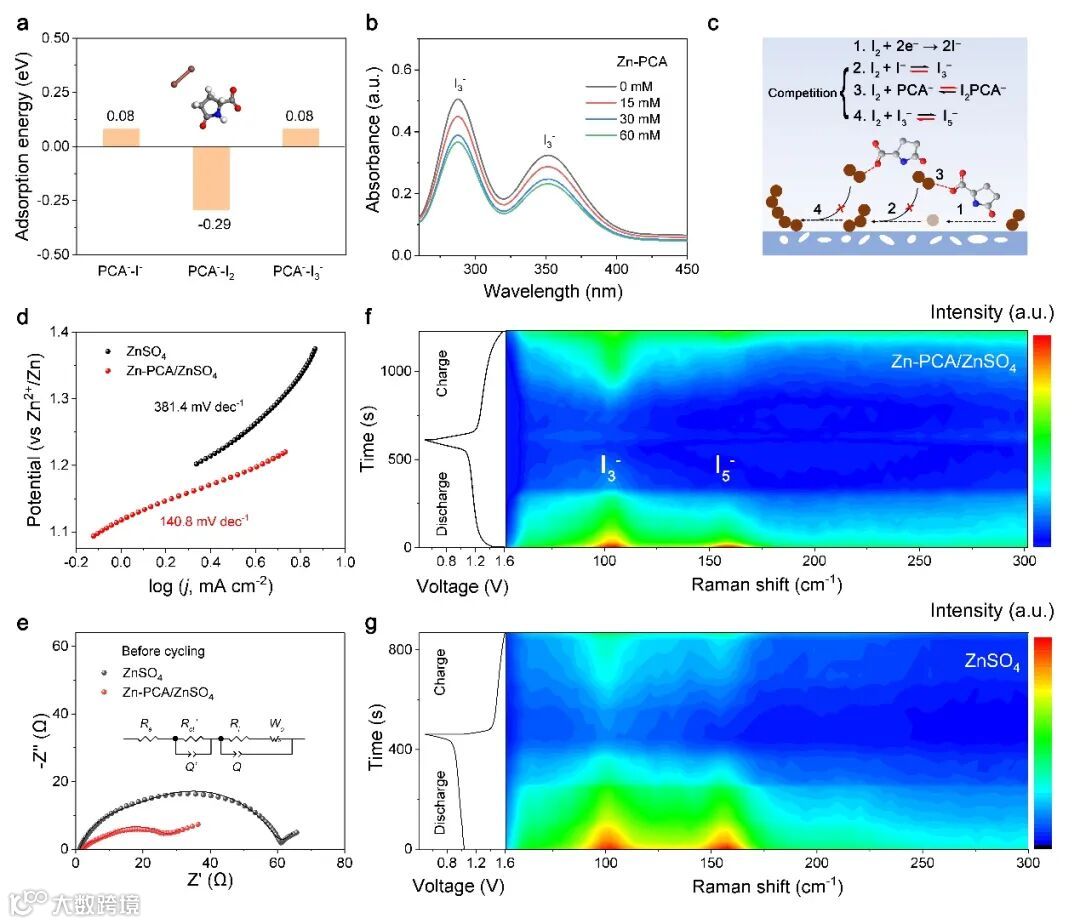 图2. 抑制多碘化物穿梭并在I2正极加速氧化还原反应。a)PCA−阴离子对I−,I2和I3−物种的吸附能。b)UV-vis光谱以确定添加不同量Zn-PCA后I3−的浓度。c)PCA−,I3−和I−向I2的竞争配位示意图。d)对应CV曲线(氧化过程)的Tafel图。e)循环前含有/不含有Zn-PCA添加剂的全电池的EIS光谱和等效电路。f,g)ZnSO4电解液中,显示I3−和I5−物种在恒电流充放电过程中的碘物种演变机制的Raman光谱f)有和g)无Zn-PCA。
