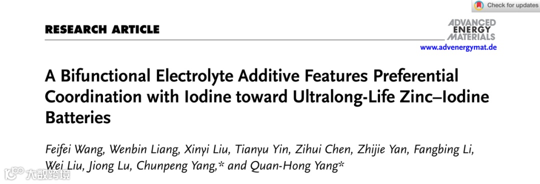 近日,天津大学的杨全红教授与杨春鹏教授团队通过向电解液中引入一种双功能添加剂优先与碘配位,降低多碘离子浓度进而抑制多碘离子的穿梭效应,实现超长寿命的锌碘电池。该文章发表在Advance Energy Materials上。题目为“A Bifunctional Electrolyte Additive Features Preferential Coordination with Iodine Toward Ultralong-Life Zinc-Iodine Batteries”。